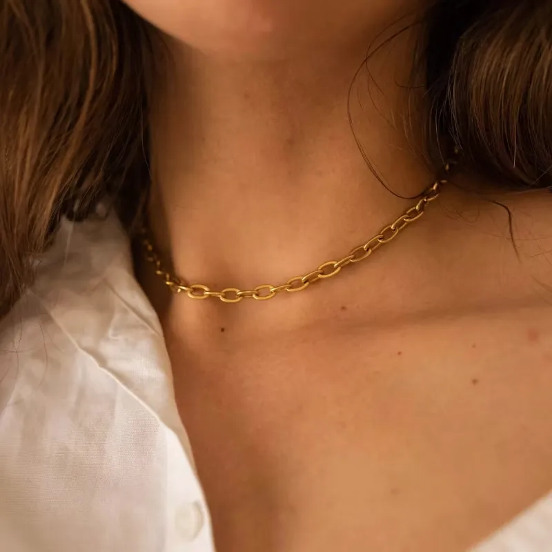 Crafted from durable stainless steel and elegantly coated with 18Kt gold plating, this gold chain link necklace exudes sophistication and timeless charm. Its robust design ensures longevity while the radiant finish adds a touch of luxury to any outfit. Perfect for layering or wearing solo, this versatile piece is a must-have accessory that effortlessly transitions from day to night. Treat yourself or gift it to someone special for a stylish statement that never goes out of fashion.