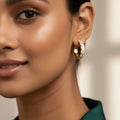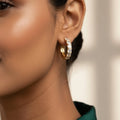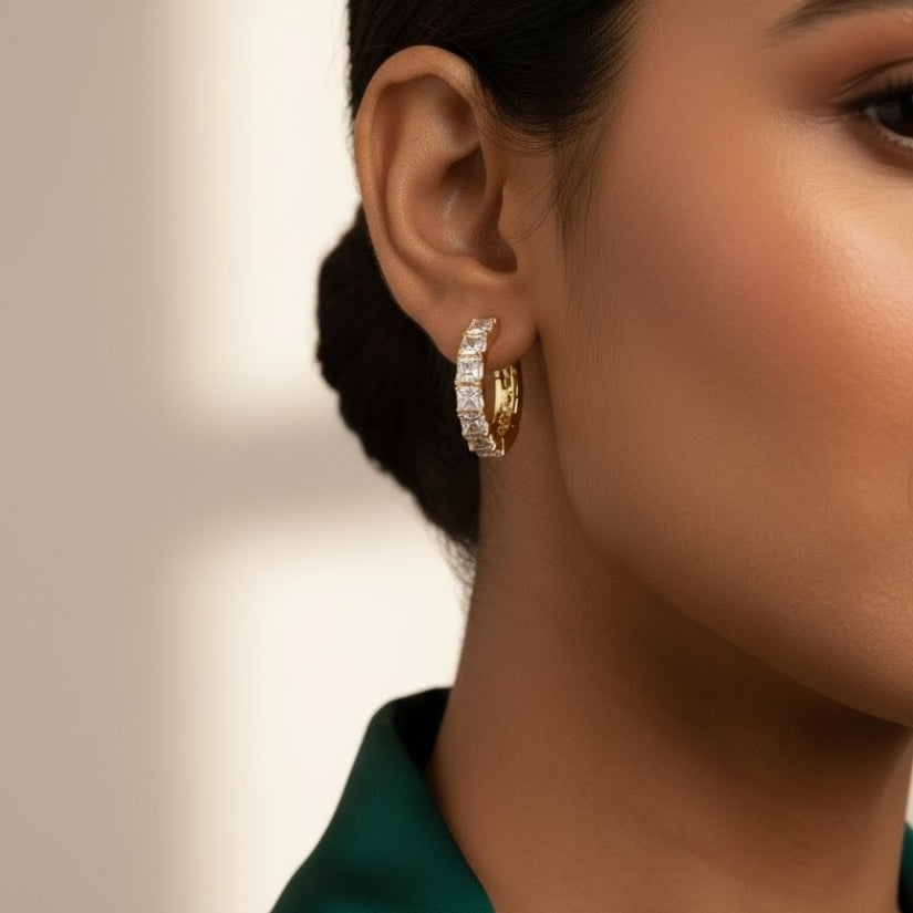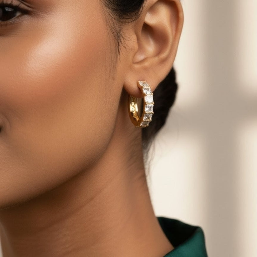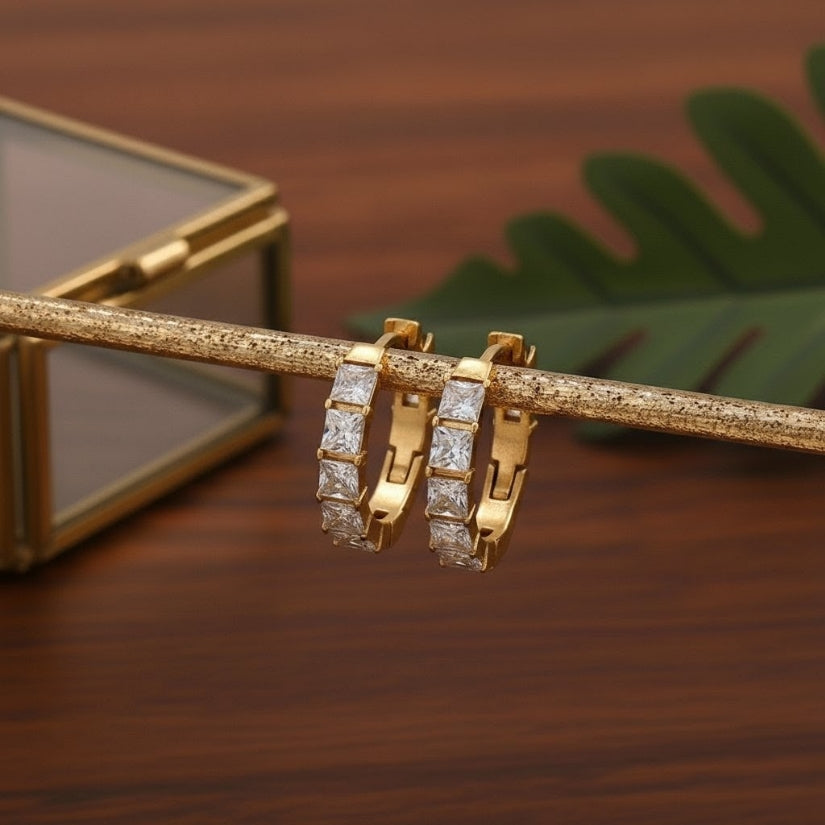 Add a touch of elegance to your jewelry collection with these stunning gold tone hoop earrings adorned with sparkling diamonds. Crafted from durable stainless steel and finished with luxurious 18Kt gold plating, these earrings offer both style and longevity. Their versatile design makes them perfect for any occasion, whether you're dressing up for a night out or adding a hint of glamour to your everyday look. Shine bright and make a statement with these exquisite hoops that effortlessly blend sophistication and charm.