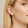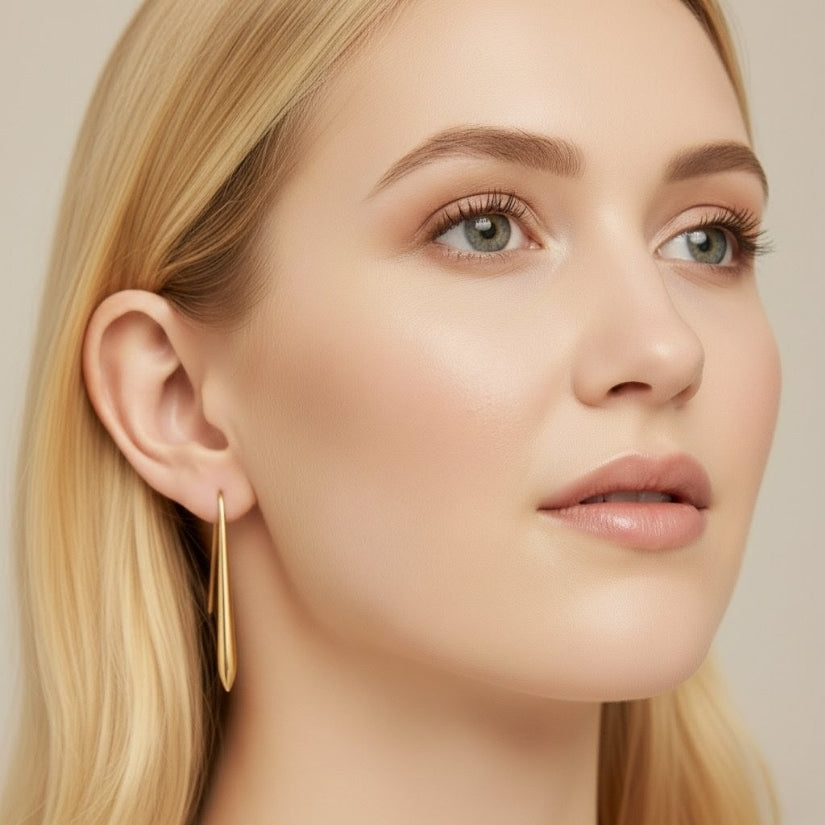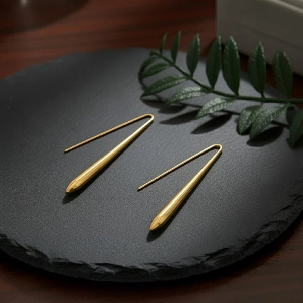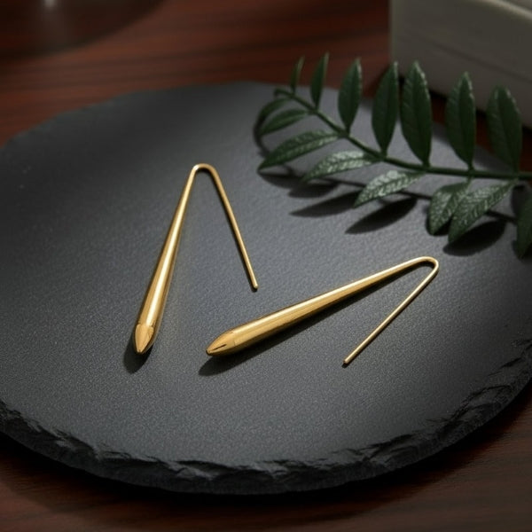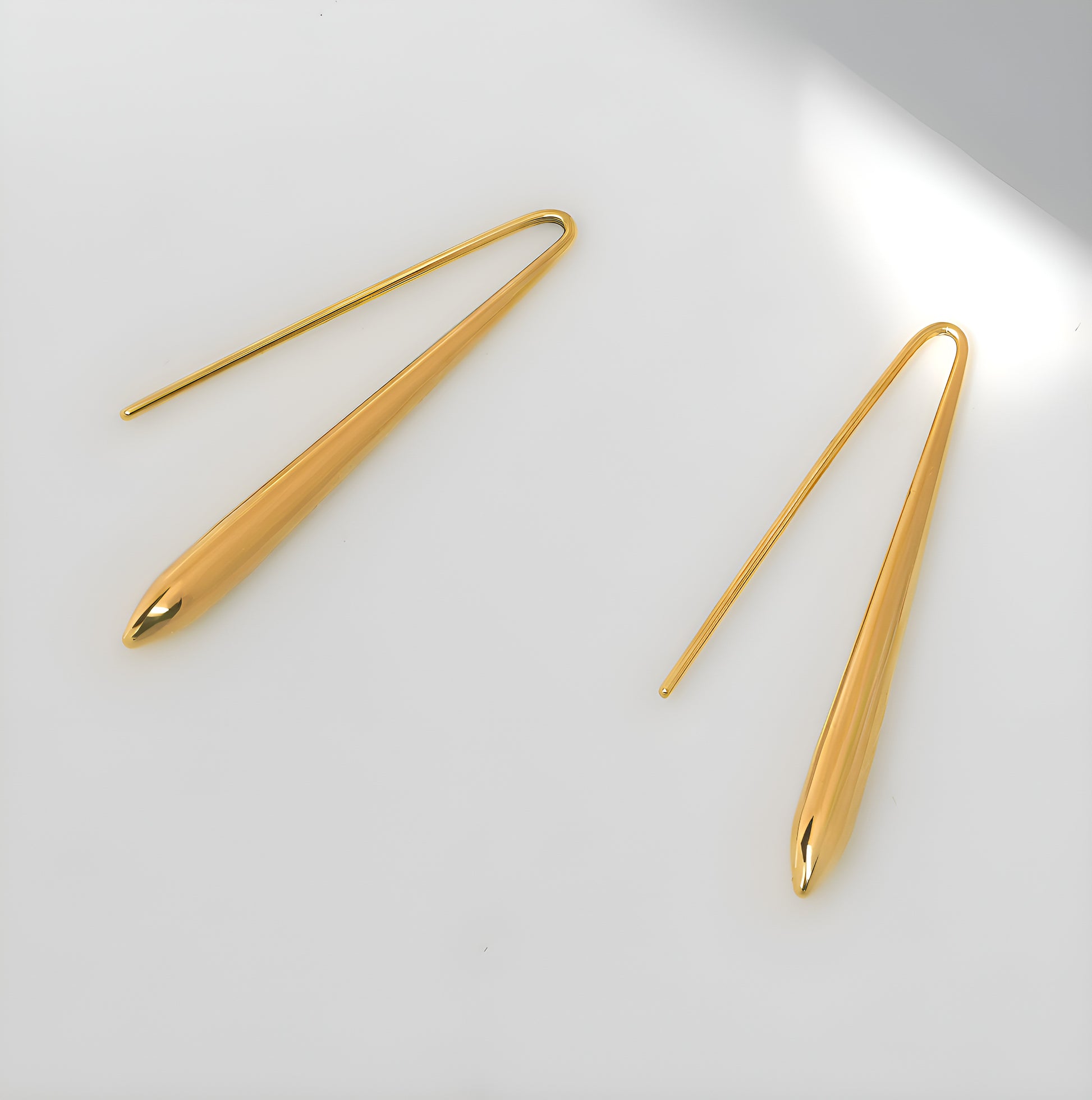 These stunning gold-plated earrings feature a sleek, elongated design that gracefully curves to catch the light with every movement. Crafted from durable stainless steel and adorned with 18Kt gold plating, they offer a luxurious look without compromising on comfort. Perfect for both casual outings and elegant evenings, these earrings are a versatile addition to any jewelry collection, adding a touch of sophistication to your ensemble. Treat yourself or surprise a loved one with this chic accessory that effortlessly enhances any outfit.