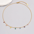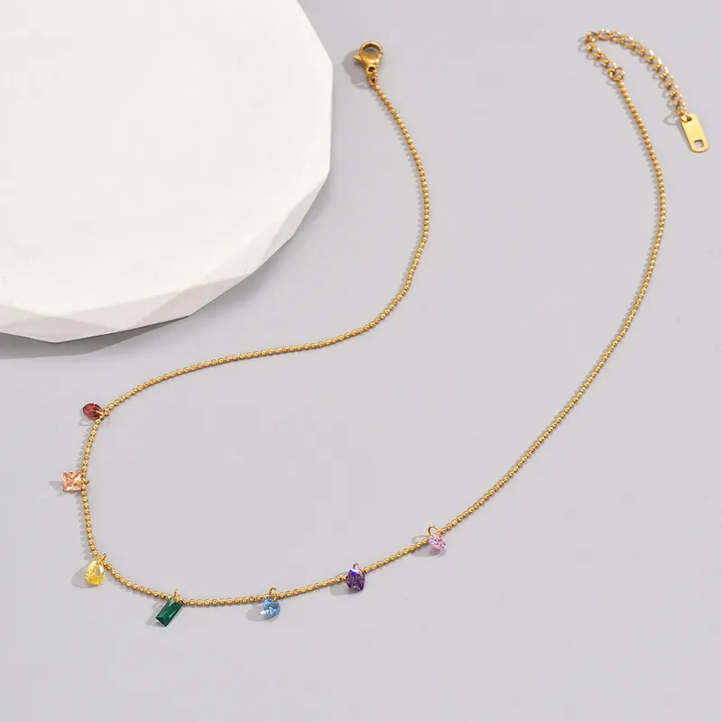 Add a touch of elegance to your jewelry collection with this stunning gold chain necklace adorned with vibrant multi-colored stones. Crafted from durable stainless steel and finished with luxurious 18Kt gold plating, this necklace not only shines brightly but also stands the test of time. The playful array of colors makes it a versatile accessory, perfect for dressing up any outfit or adding a pop of fun to your everyday look. Treat yourself or surprise a loved one with this eye-catching piece that effortlessly combines style and quality.