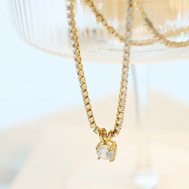 This stunning white stones necklace features a delicate chain crafted from durable stainless steel, beautifully enhanced with 18Kt gold plating for a luxurious finish. The sparkling white stones adds a touch of elegance, making it the perfect accessory for any occasion. Whether you're dressing up for a night out or adding a hint of glamour to your everyday look, this necklace is sure to turn heads and become a cherished addition to your jewelry collection. Treat yourself or surprise a loved one with this timeless piece that radiates sophistication and style.