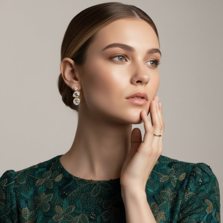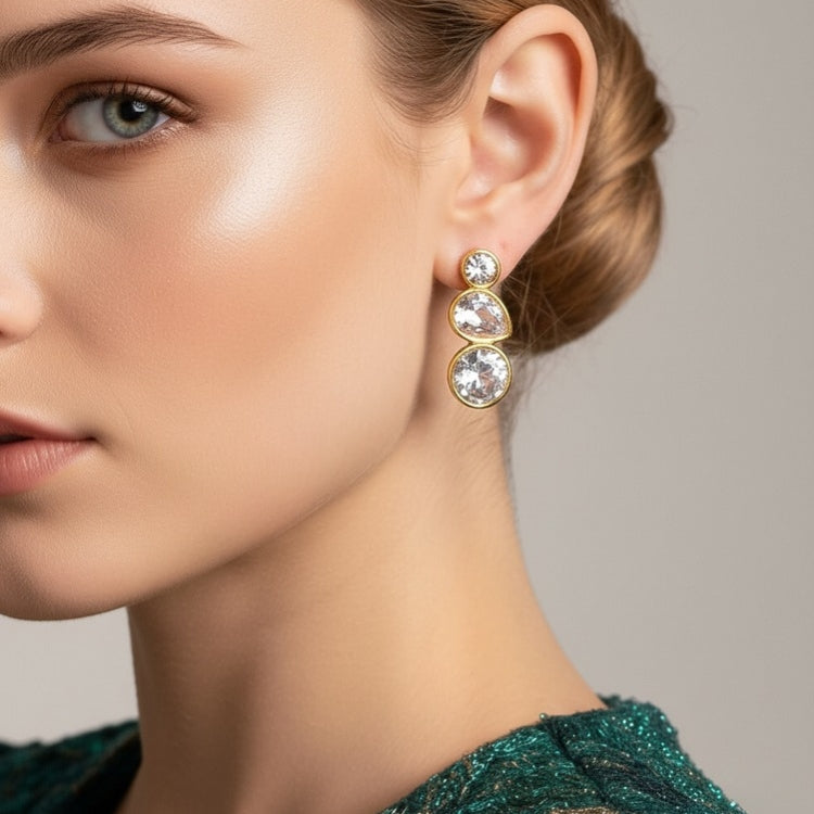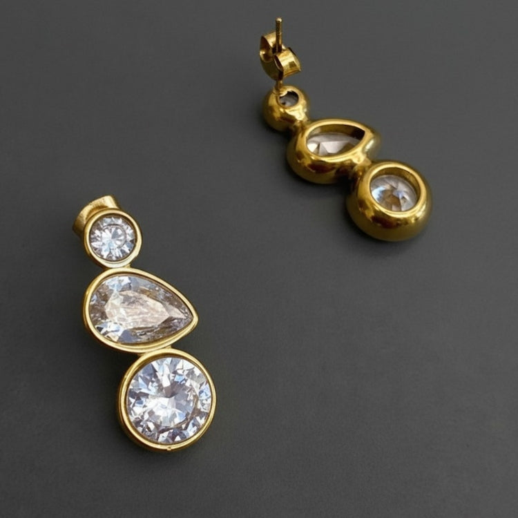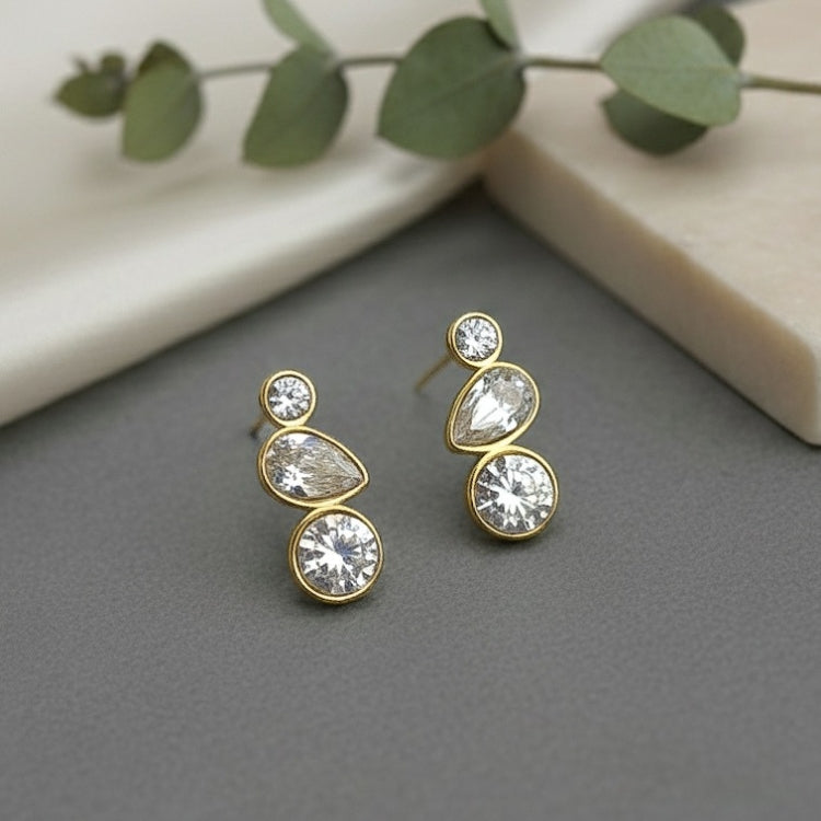 Add a touch of sophistication to your jewelry collection with these stunning gold and white CZ diamond earrings. Crafted from durable stainless steel and adorned with luxurious 18Kt gold plating, they offer a perfect blend of elegance and resilience. The sparkling white CZ diamonds catch the light beautifully, making these earrings an ideal accessory for both everyday wear and special occasions. Treat yourself or surprise a loved one with a gift that radiates style and charm.