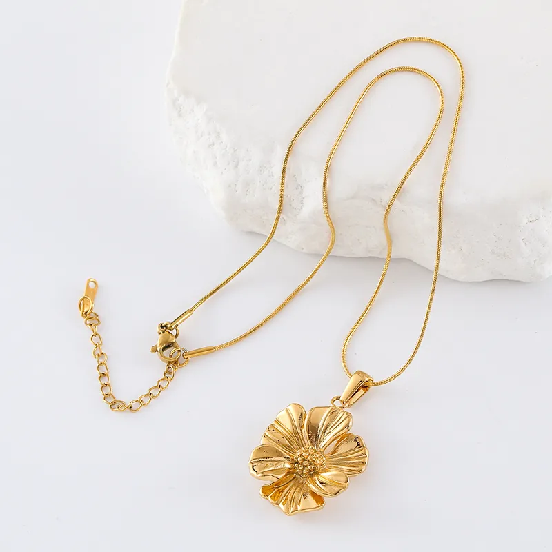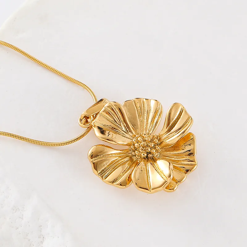 Elevate your accessory game with our stunning gold-plated necklace featuring a delicate flower pendant. Crafted from durable stainless steel and adorned with luxurious 18Kt gold plating, this necklace combines elegance and resilience for everyday wear. Its free-size design ensures a comfortable fit for all, making it the perfect addition to any outfit, whether you're dressing up for a special occasion or adding a touch of charm to your casual look. Treat yourself or surprise a loved one with this timeless piece that embodies beauty and sophistication.