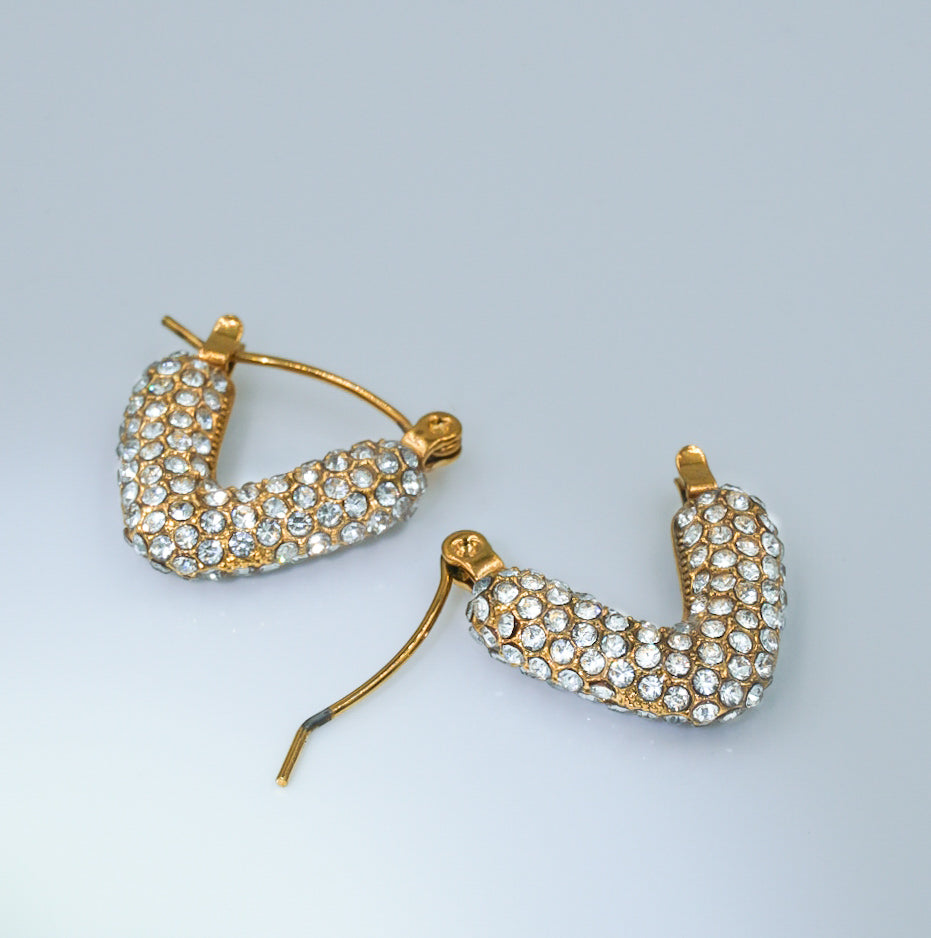 Indulge in the timeless elegance of these stunning gold tone earrings, beautifully adorned with sparkling CZ stones. Crafted from durable stainless steel and finished with luxurious 18Kt gold plating, these earrings offer both style and longevity. Their versatile design makes them perfect for any occasion, whether you're dressing up for a night out or adding a touch of glamour to your everyday look. Treat yourself or surprise a loved one with this exquisite accessory that effortlessly enhances any outfit.