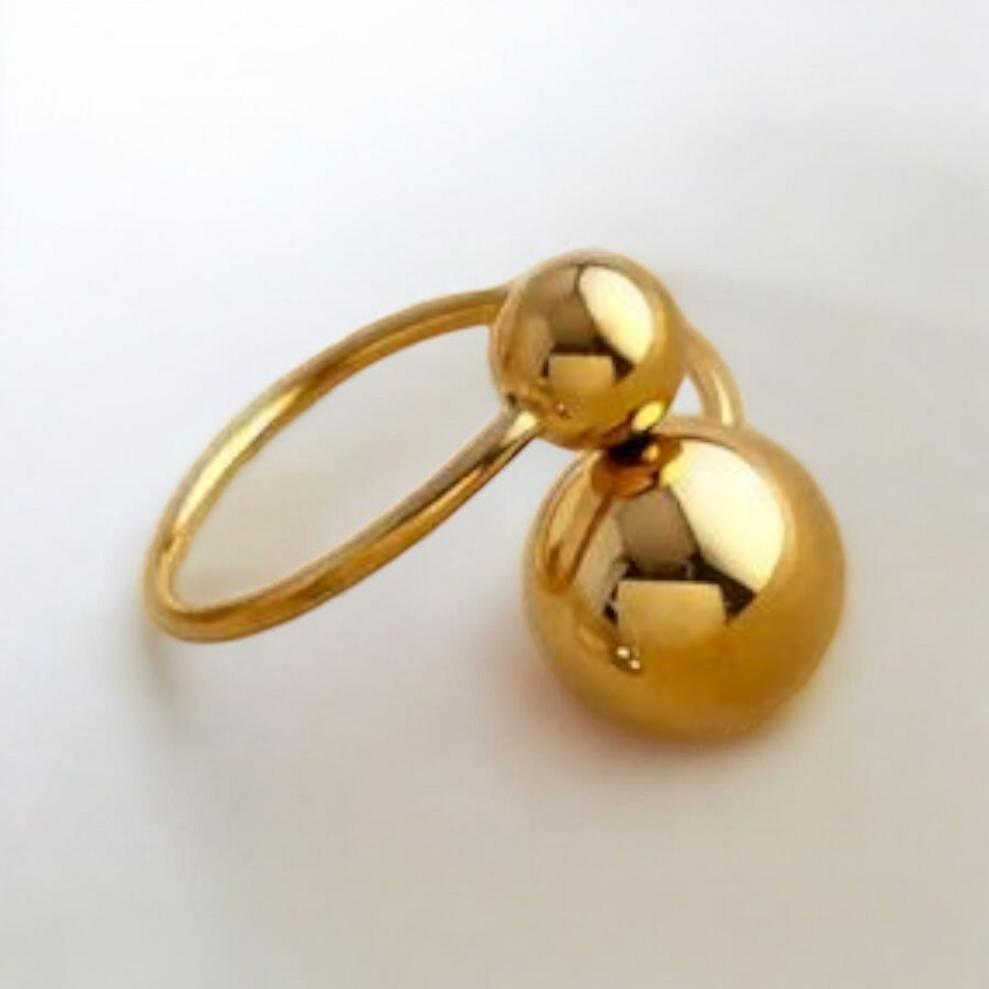 This stunning ring features a sleek design with a polished gold ball elegantly perched atop a smooth band, complemented by a matching gold ball on the side. Crafted from durable stainless steel and adorned with luxurious 18Kt gold plating, it offers both style and resilience. Perfect for adding a touch of sophistication to any outfit, this piece is a must-have for those who appreciate modern elegance. Treat yourself or surprise a loved one with this timeless accessory that effortlessly enhances any jewelry collection.