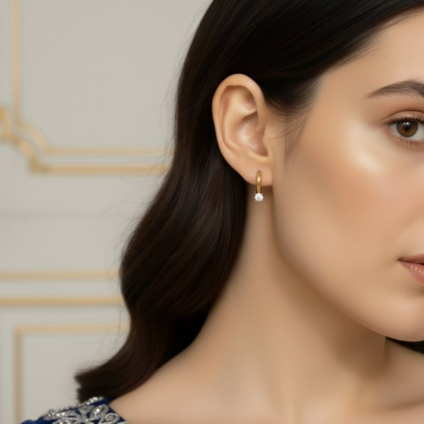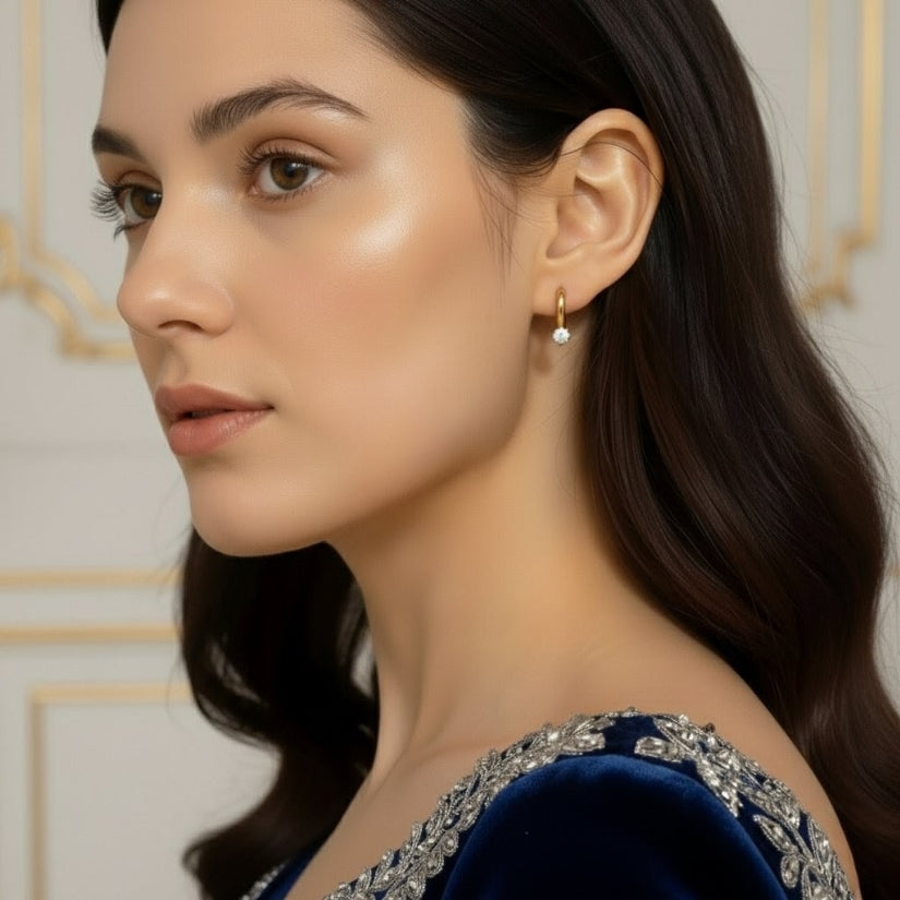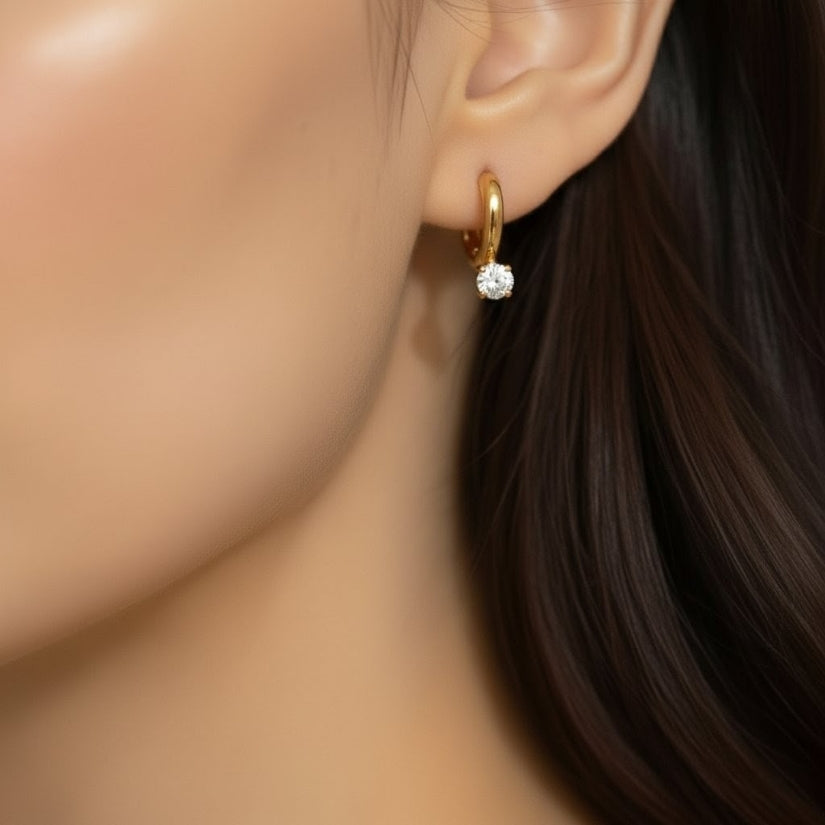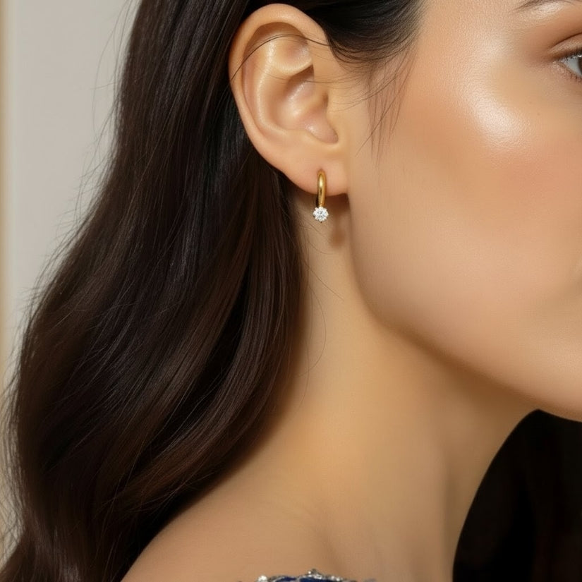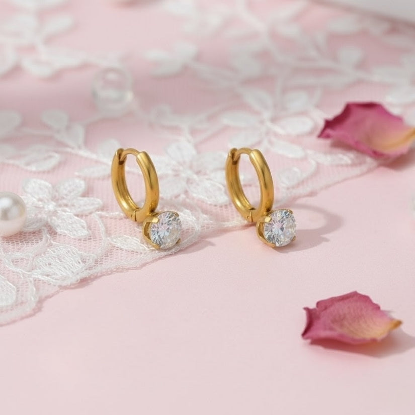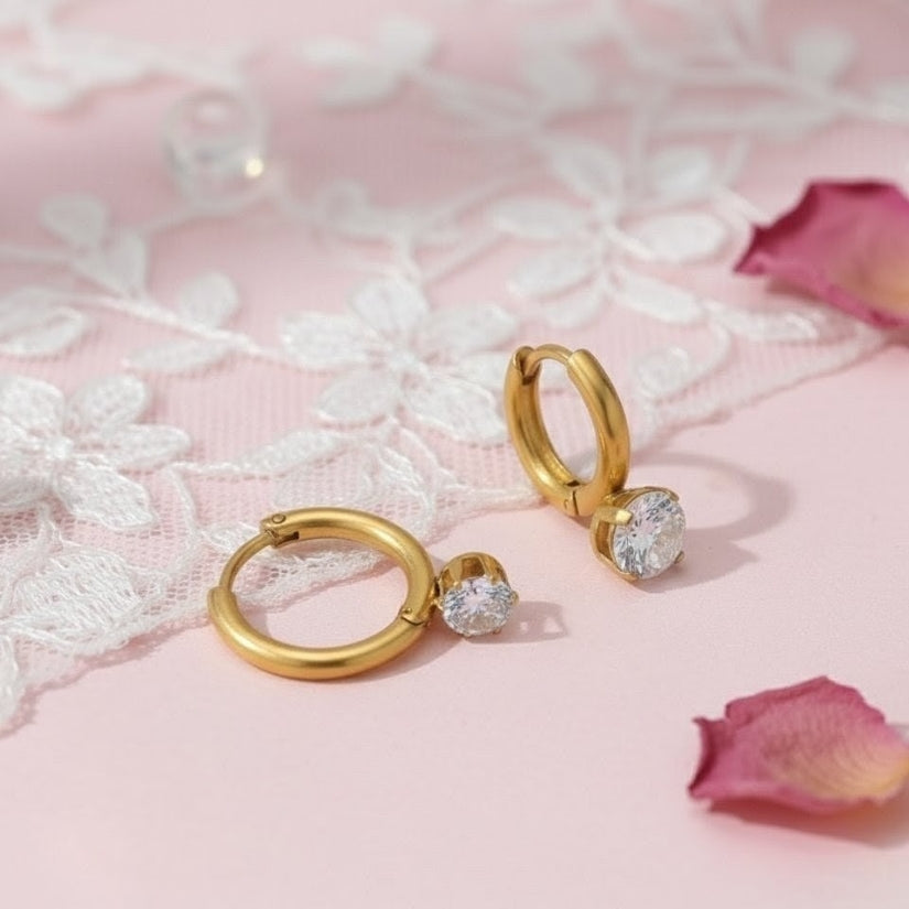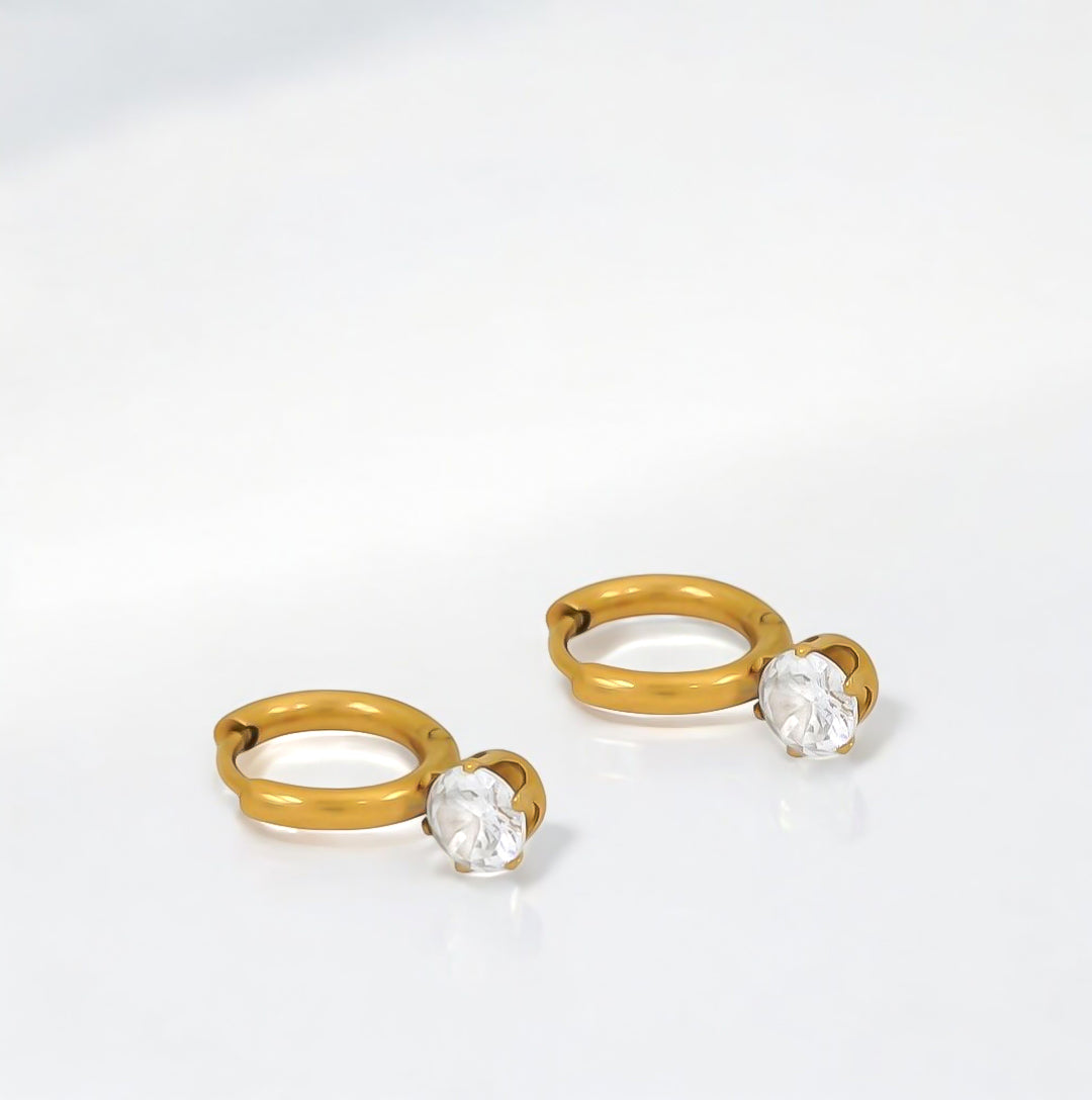 Add a touch of glamour to your jewelry collection with these stunning gold tone hoop earrings, featuring a sparkling crystal stone that catches the light beautifully. Crafted from durable stainless steel and finished with luxurious 18Kt gold plating, these earrings are designed to withstand everyday wear while making a bold statement. Perfect for both casual outings and special occasions, they effortlessly enhance any outfit, making you shine with confidence. Treat yourself or surprise a loved one with this exquisite accessory that combines elegance and versatility.