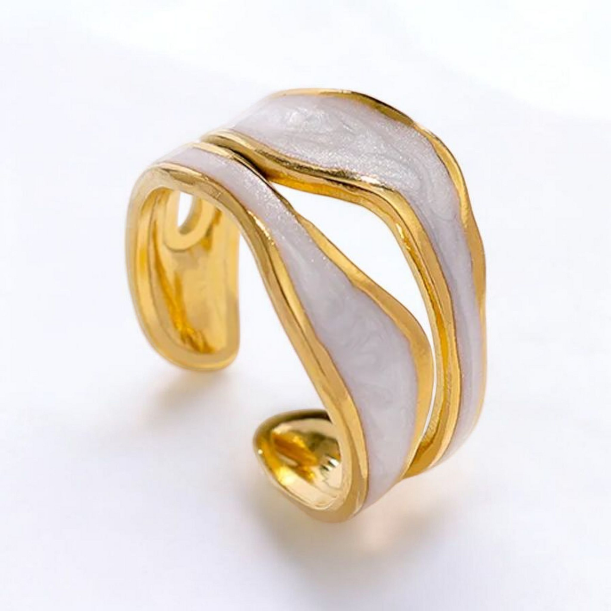 This stunning gold and white ring features a captivating wave pattern that adds a touch of elegance to any outfit. Crafted from durable stainless steel and adorned with luxurious 18Kt gold plating, it combines style and resilience for everyday wear. Perfect for stacking or wearing solo, this ring is a versatile accessory that enhances your personal style while making a bold statement. Treat yourself or surprise a loved one with this exquisite piece that embodies both beauty and sophistication.